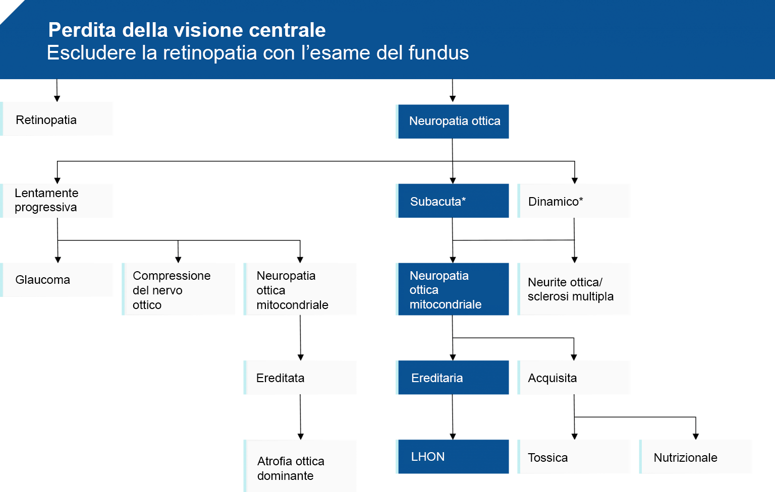 *L’evoluzione della LHON nelle prime settimane/mesi viene descritta canonicamente come dinamica/subacuta, a seconda di quanto rapidamente evolve la perdita di acuità visiva.Footnote15